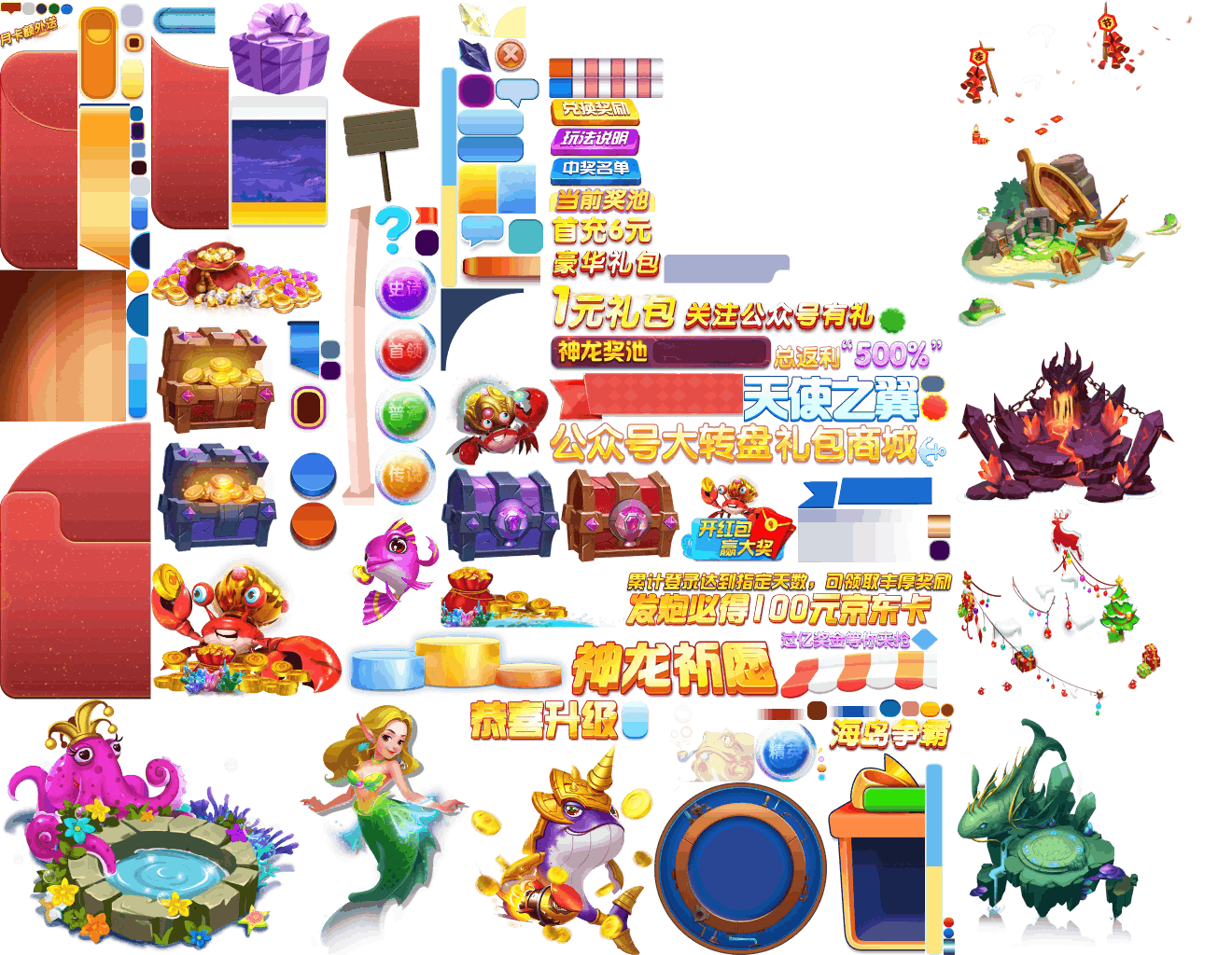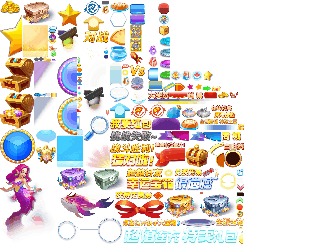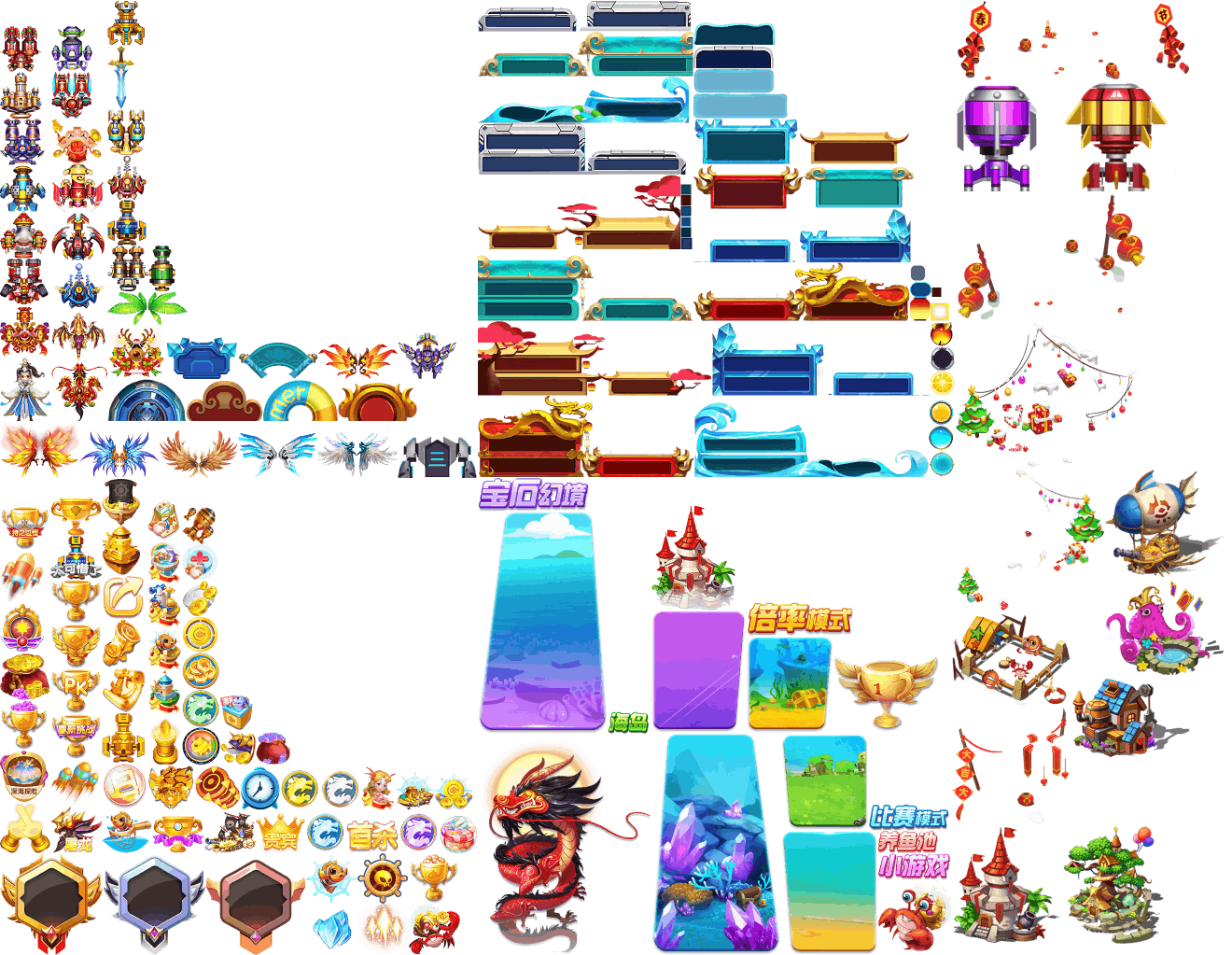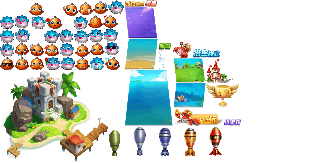 (展示素材已压缩)展示UI为源文件大小的50%(仅展示部分)!整包素材,包含音乐音效等素材~ 捕鱼海岛游戏素材