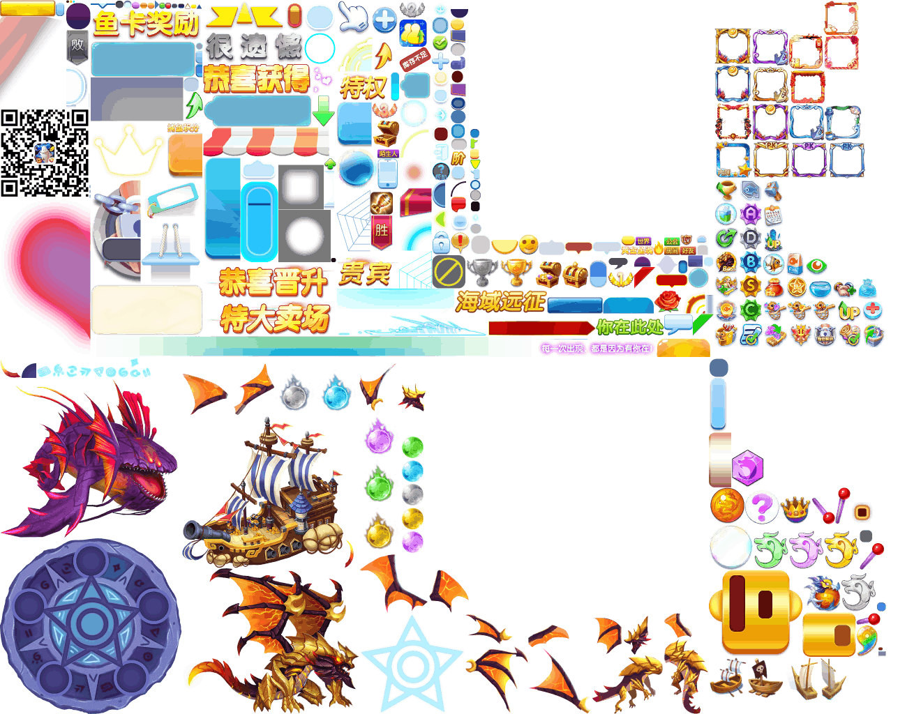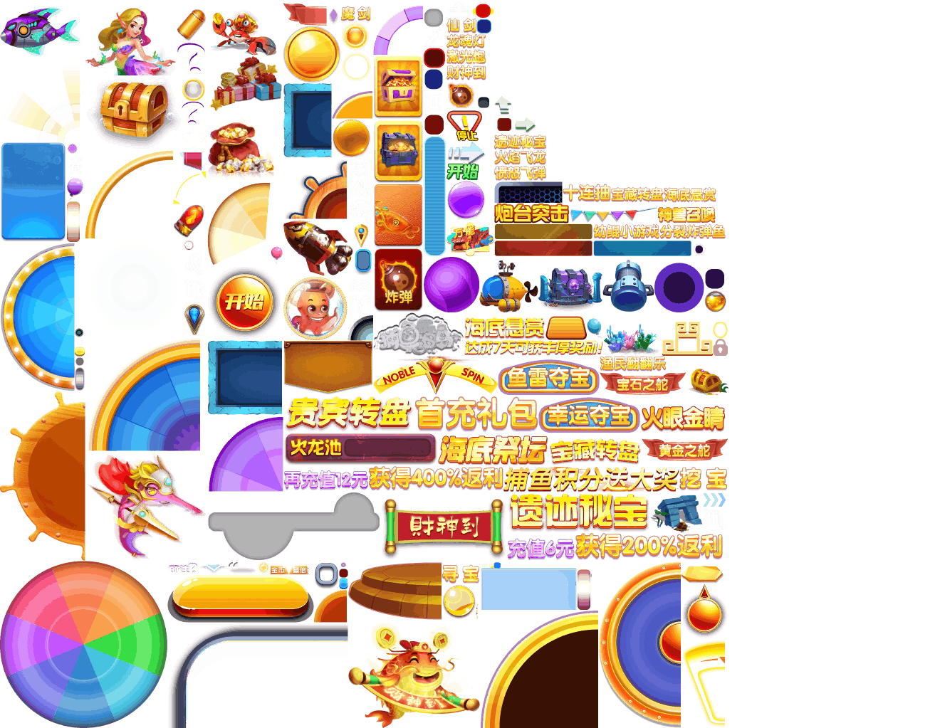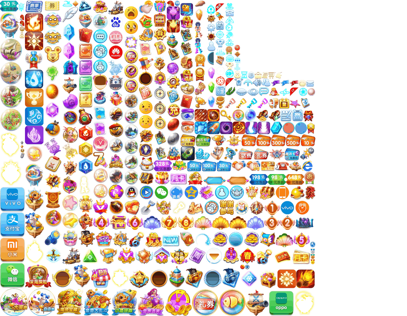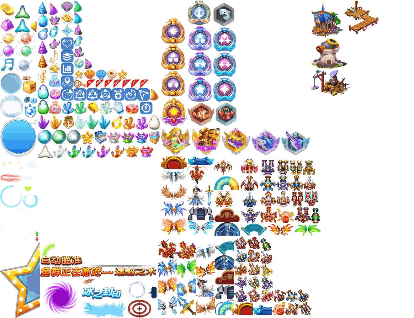 (展示素材已压缩)展示UI为源文件大小的50%(仅展示部分)!整包素材,包含音乐音效等素材~ 捕鱼海岛游戏素材