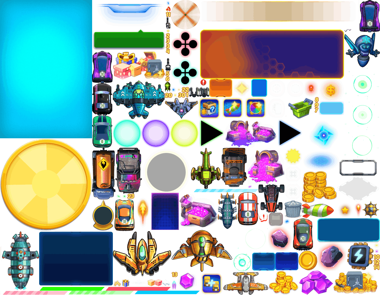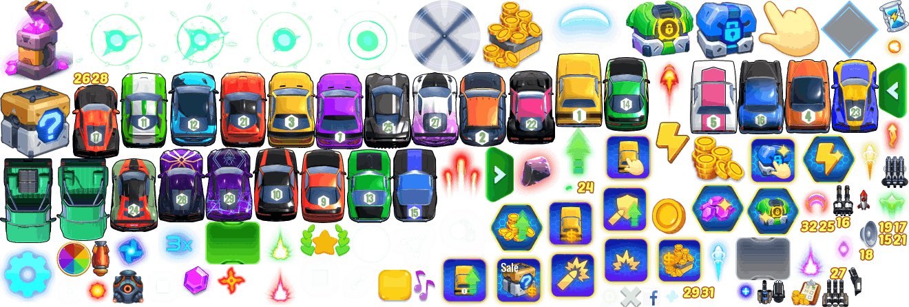 (展示素材已压缩)展示UI为源文件大小的50%(仅展示部分)!整包素材,包含音乐音效等素材~ 汽车防御挂机类素材。